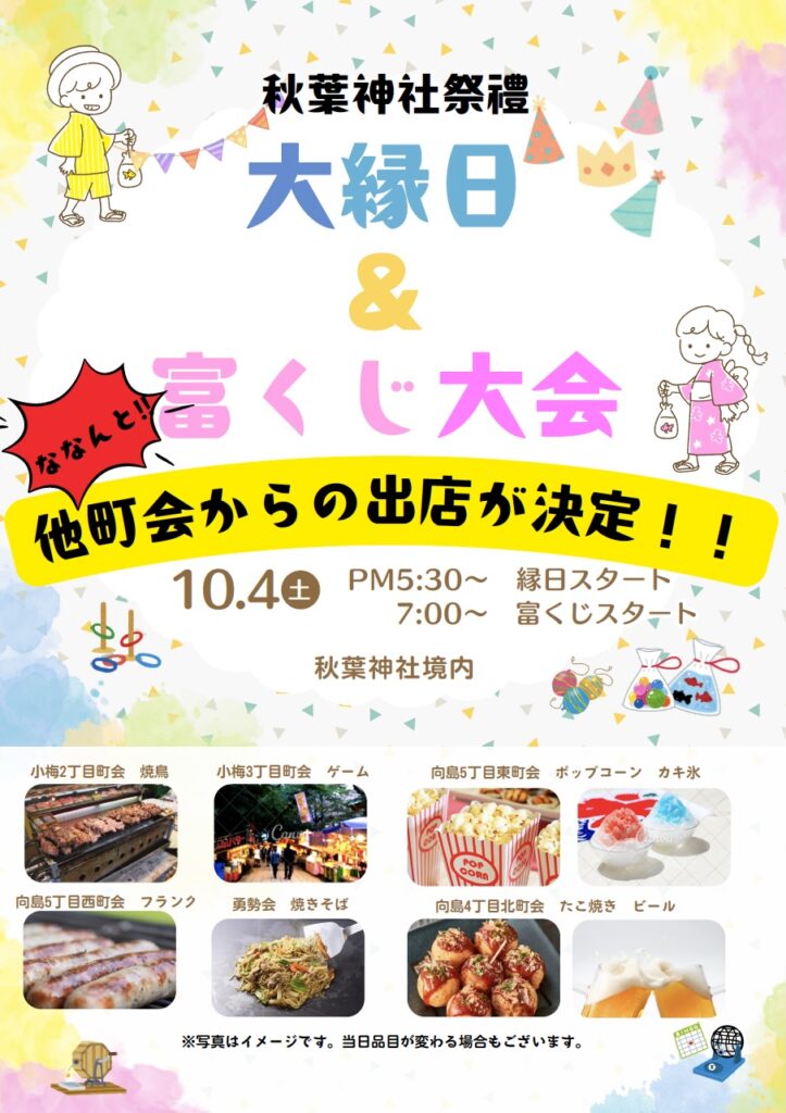 10月4日(土)秋葉神社にて縁日、富くじが行われます。|今回の縁日は他町会かの出店も多数あります。お楽しみに!