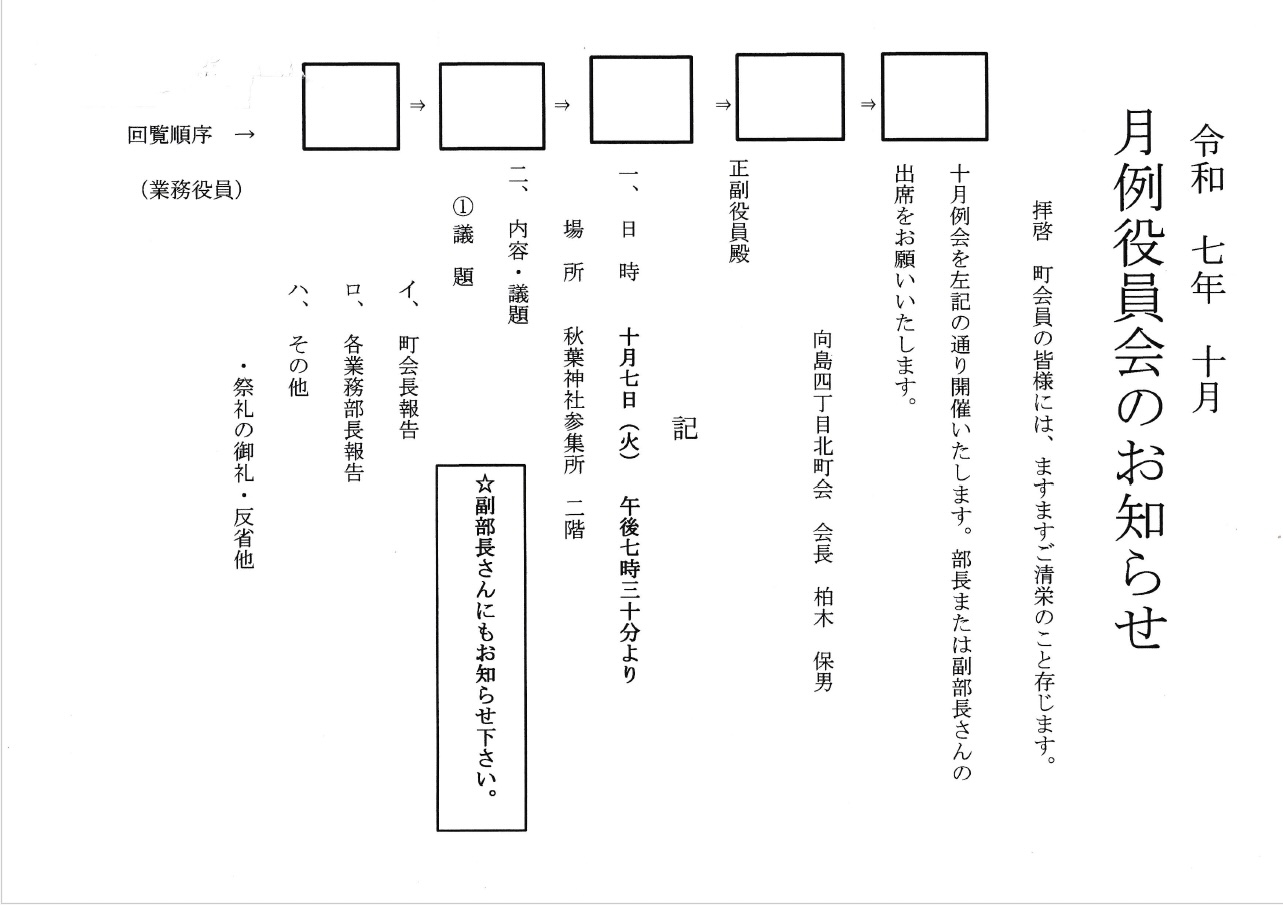 業務役員、地区役員の皆さまはご出席のほど、よろしくお願いします。
