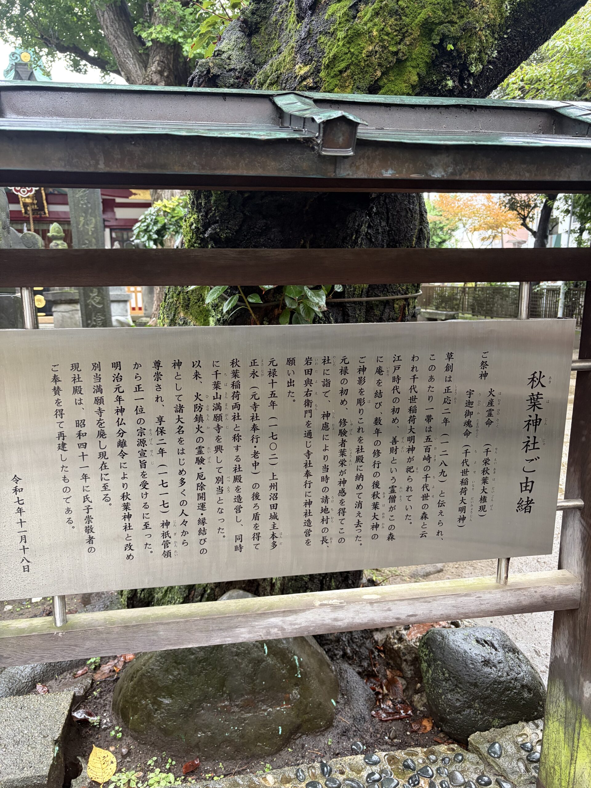 秋葉神社ご由緒 2025年10月26日 皆さんは秋葉神社境内、鳥居の隣にある説明板をご覧になったことはありますか? 秋葉神社の由緒について記されています。この度わかりやすい文章に改め、作り直しました。神社参拝の折には是非ご一読ください。