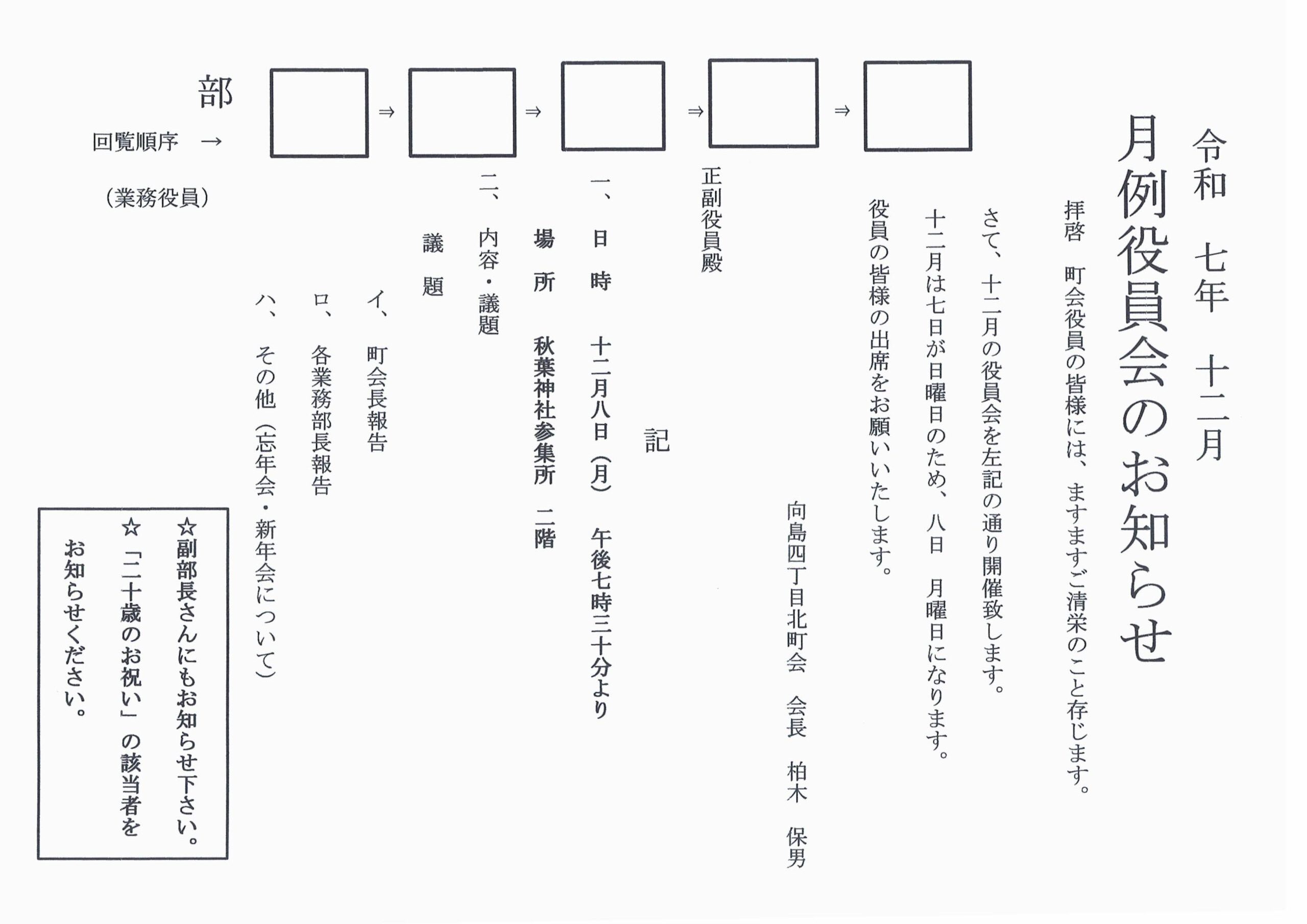 5月度月例役員会を下記の通り開催いたします。地区役員及び業務役員の皆様には是非ご出席いただきますようご案内いたします。記日時:5月7日(火)午後7時30分より場所:秋葉神社参集所二階議題:イ. 町会長挨拶   ロ. 各業務部長報告   ハ....