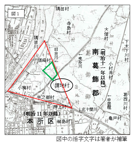明治11年(1878)の「15区6郡制(*1)」により、南葛飾郡は分割され、北十間川以南は東京府本所区に、北十間川以北が現在の葛飾・江戸川・江東区東部等と共に南葛飾郡になりました。請地村と須崎村は東京府南葛飾郡になりました(図1ではそれまでの葛飾郡と表示されている)。