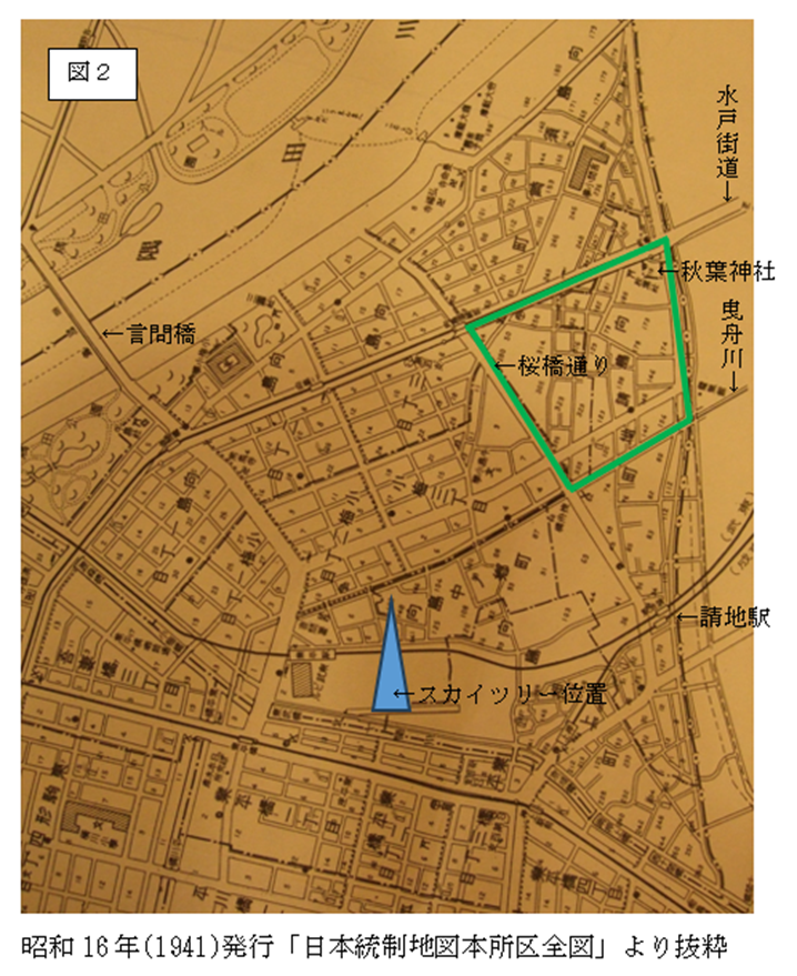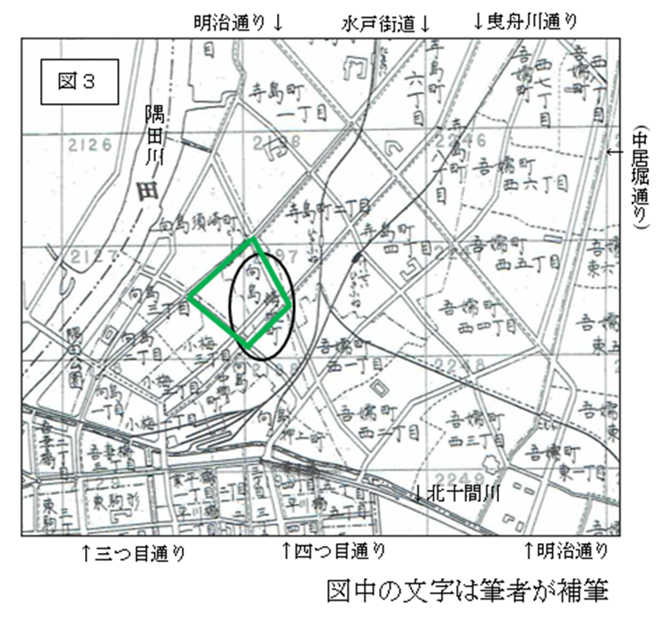 「図3」は昭和36年(1961)住宅協会地図部作成の墨田区全図から、当時の向島請地町周辺を抜粋しました。