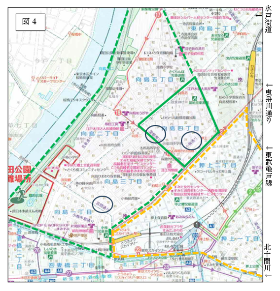隅田川・鳩の街通り・曳舟川通り・言問通り・北十間川に囲まれた地域(緑色点線枠)が墨田区向島になりました。私たちの向島請地町と向島須崎町は共に水戸街道で分断され、鳩の街通りの先に続く道・曳舟川通り・桜橋通りに囲まれた区域(緑色実線枠)が「向島4丁目」になりました。