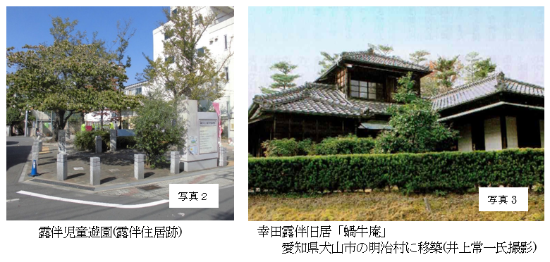 露伴が住んでいた住居跡が「露伴児童遊園」(写真2)になっています。園内には碑があり、この地に居を構えた経緯が、次の様に記されています。