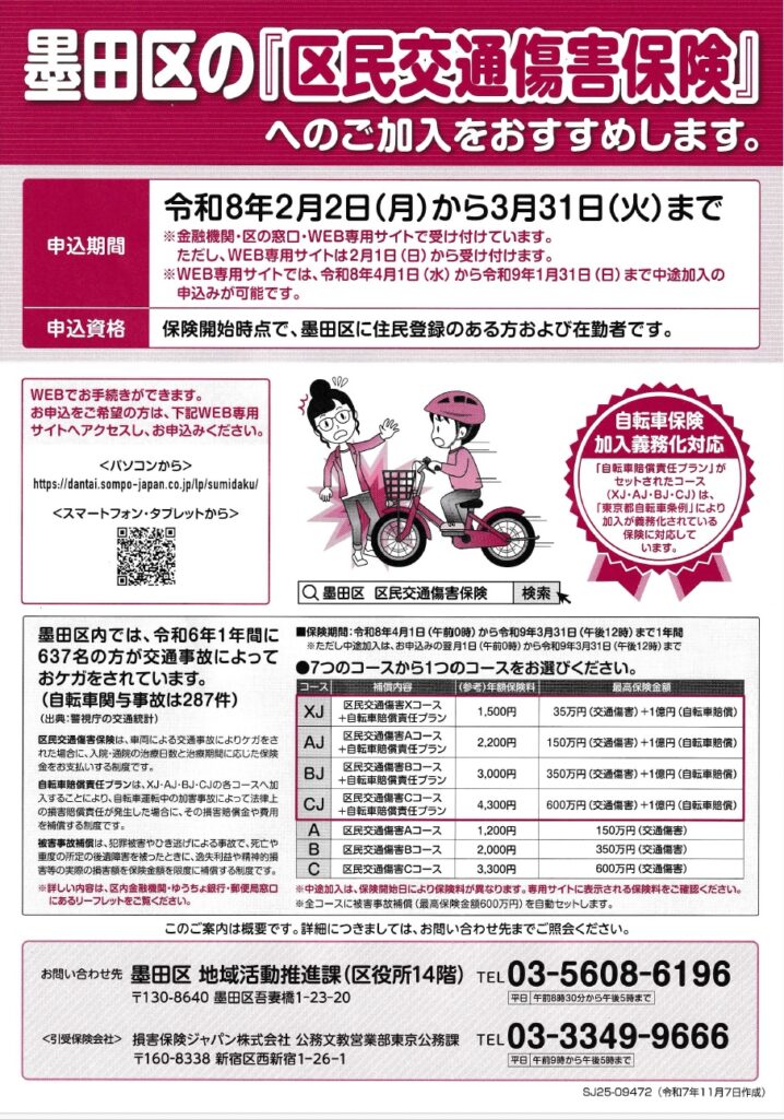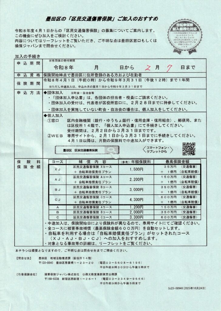 令和8年度「区民交通傷害保険」加入のご案内 2025年12月24日 申込書は地区部長が配布いたします。配布漏れの場合、または追加で必要な場合は地区部長または厚生部安田にご請求ください。 申込期限は令和8年2月7日(土)です。