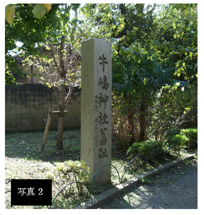 牛嶋神社は、関東大震災までは500mほど北にある弘福寺裏に隣接した地にありました。現在はこの地に旧址の石碑(写真2)が設置されています。震災によりお社が焼失、墨堤の拡幅工事もあり、昭和7年(1932)現在地に遷座しました。