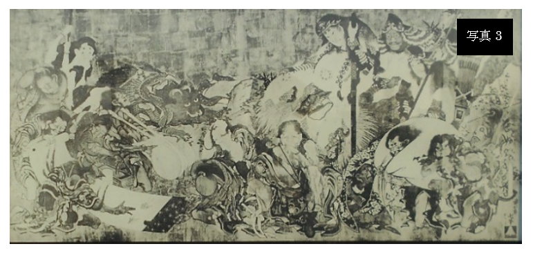 現在は原寸大の復元パネル(写真3)が社殿内に掲げられています。絵は、命(みこと)が悪病をもたらす厄神に悪事を働かない様、証文を書かせている場面です。平成28年(2016)に色彩の推定復元された絵が、すみだ北斎美術館に展示されています。(説明板より)