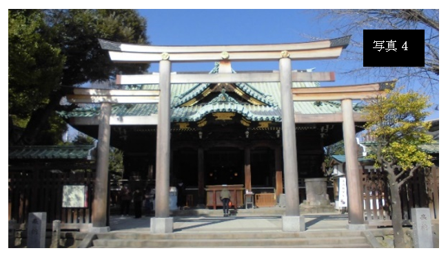 社殿前に「三つ鳥居」(写真4)と呼ばれる大変珍しい鳥居があります。これはご祭神が三柱であることに由来するそうです。同様の三つ鳥居は奈良県桜井市にある日本最古の神社の一つと言われている「大神(おおみわ)神社」にもあります。
