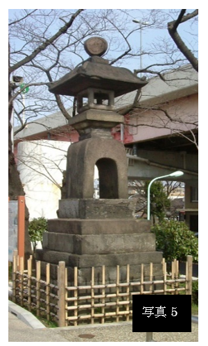 石造り神牛、石造り狛犬(享保14年銘 一対)、同(文政10年銘 一対)、力石群、烏亭焉馬(うていえんば注5)「いそかすは」の狂歌碑、石造り鳥居、社殿、神輿蔵、墨堤に残された石造り永代常夜灯(写真5)等があります。